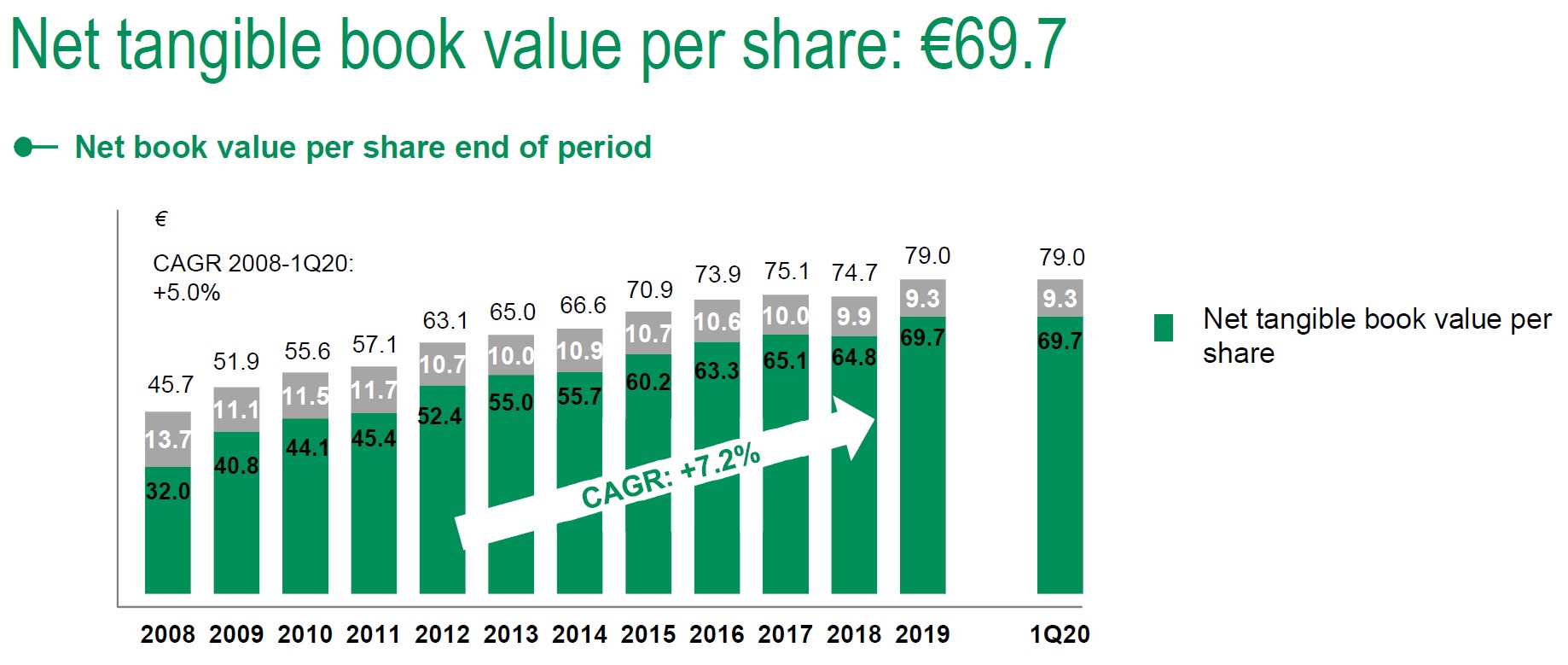 In another sign that BNP Paribas has acquitted itself quite well since the Great Financial Crisis, it has managed to grow its tangible book value per share by a 7.2% compound annual growth rate (CAGR) between 2008 and 2019, as one can see in the graphic below.