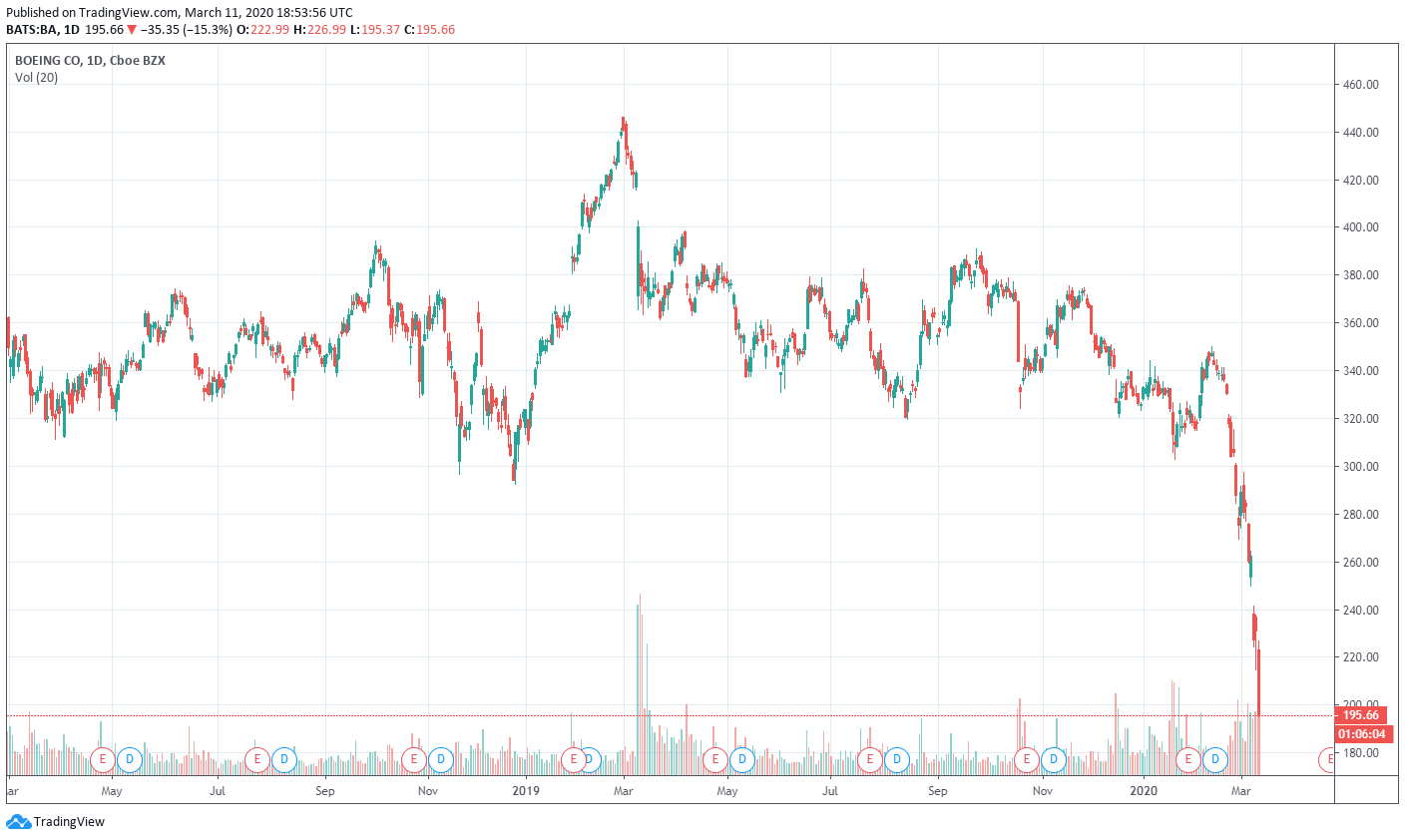 During the trading session March 11, Boeing’s shares have collapsed below $200, trading off about 15%. The aerospace giant announced that it will fully drawdown its $13.8 billion term loan (as credit markets tighten) and that it registered a net loss of 28 orders during the month of February. Things are not looking good, and the company even halted hiring due to a perceived “cash crunch.” Boeing’s airline customers are in pain (travel demand is slowing as a result of COVID-19) and the continued problems with the 737 MAX have combined to create a whirlwind of hurt for the aircraft maker.