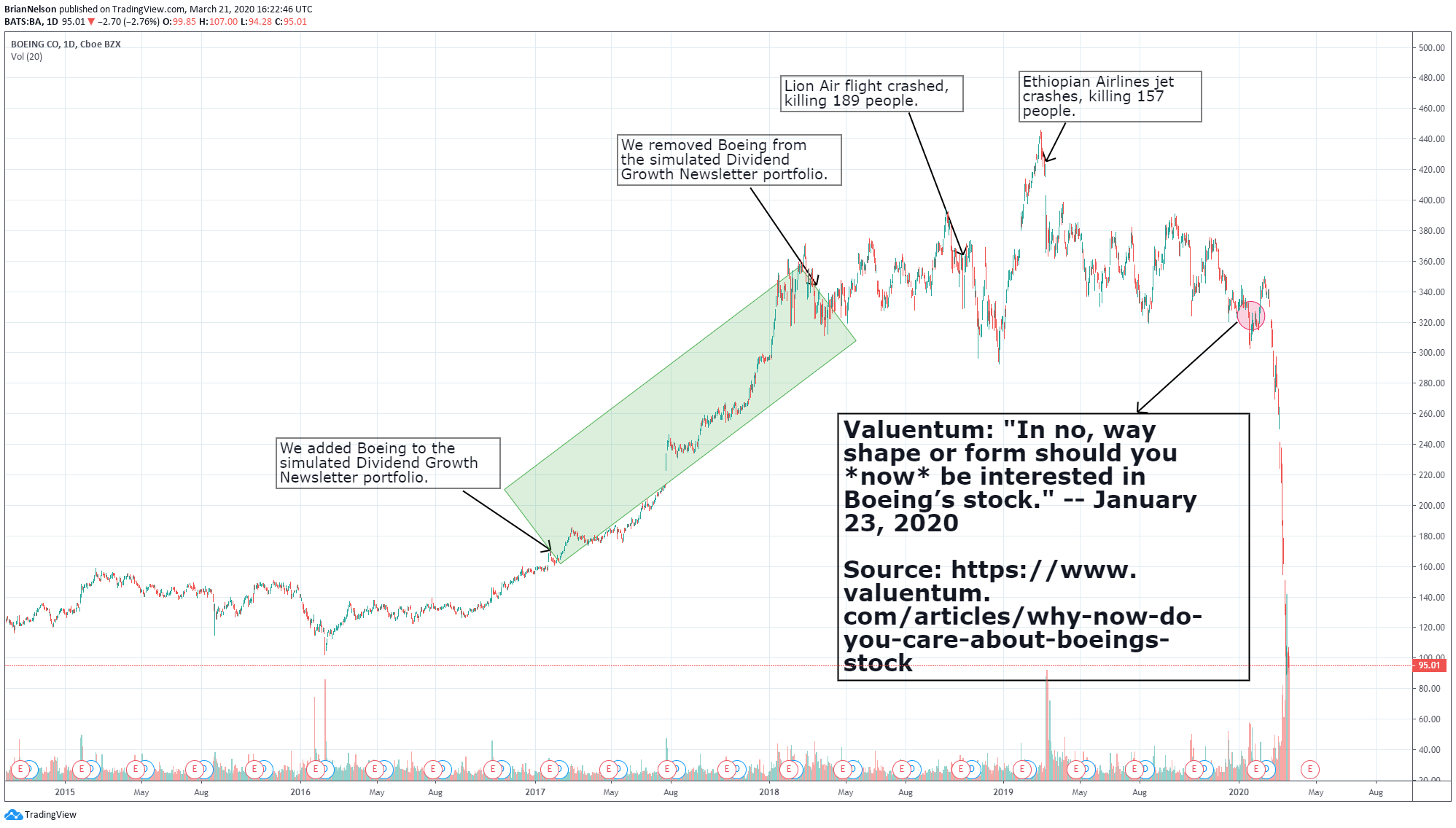 Image: Boeing was added to the Dividend Growth Newsletter portfolio January 27, 2017, and removed March 16, 2018, prior to the unfortunate accidents that have claimed the lives of hundreds of people. We warned readers to stay far away of Boeing’s stock days before its huge collapse. The rating agencies have slashed Boeing’s credit rating, and the firm has now suspended its dividend.
