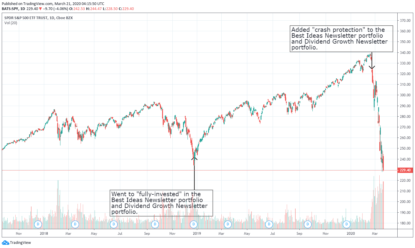Image: In December 2018, we took both the Best Ideas Newsletter portfolio and Dividend Growth Newsletter portfolio to an “all-in” position, expecting a melt up in the markets. On February 22, we warned members of an impending stock market crash, alerting them about “portfolio protection.”
