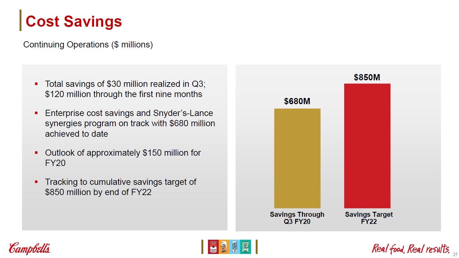 Image Shown: Campbell’s is targeting additional cost savings over the coming years on top of the savings already realized in the wake of its Snyder’s-Lance deal. Image Source: Campbell– Third Quarter of Fiscal 2020 Earnings IR Presentation