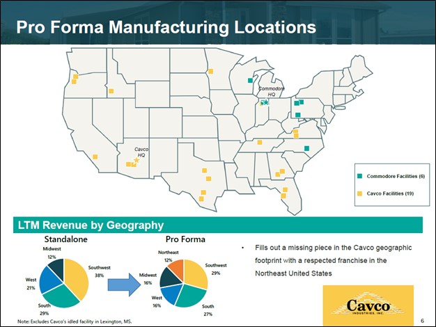 Image Shown: The combination of Cavco Industries and Commodore will result in a company with significant scale in the manufactured and modular housing arena, with an eye towards expansive manufacturing, retail, and distribution operations in North America with room for numerous synergies. Image Source: Cavco Industries – Acquisition of Commodore July 2021 Presentation