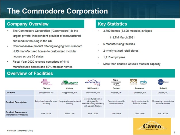 Image Shown: An overview of Commodore’s operations and business profile. Image Source: Cavco Industries – Acquisition of Commodore July 2021 Presentation