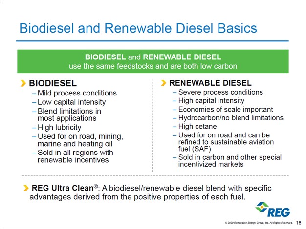 Image Shown: Renewable Energy Group produces biodiesel, renewable diesel, and a biodiesel/renewable diesel blend. Image Source: Renewable Energy Group – October 2020 IR Presentation