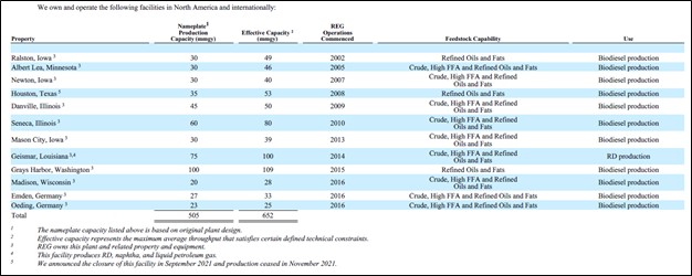 In November 2021, Renewable Energy Group ceased production operations at its biorefinery in Houston, Texas. As of the end of December 2021, Renewable Energy Group had ten biorefineries in the US (nine of which are operational) and two in Germany. Combined, these facilities have 470 million gallons of nameplate production capacity per year though the firm notes that its effective capacity is higher at 599 million gallons per year (these figures do not include capacity at its plant in Houston).