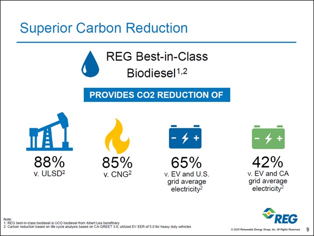 Image Shown: Biofuel emits significantly less CO2 when compared to other forms of fuel, including ultra-low sulfur diesel, compressed natural gas, and electric power from the US power grid at-large. Image Source: Renewable Energy Group – October 2020 IR Presentation