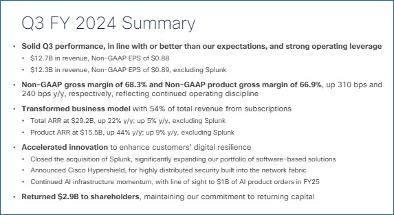 Revenue, gross margin and non-GAAP EPS in Q3 were at the high end or above our guidance range, both including and excluding Splunk, resulting in continued operating leverage. Customers are consuming the equipment shipped over the last few quarters in line with our expectations and we are seeing stabilization of demand as a result. The addition of Splunk to our product line will be a catalyst for further growth.