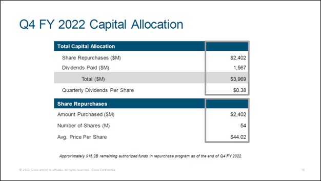Image Shown: Cisco Systems Inc is incredibly shareholder friendly. Image Source: Cisco Systems Inc – Fourth Quarter of Fiscal 2022 IR Earnings Presentation