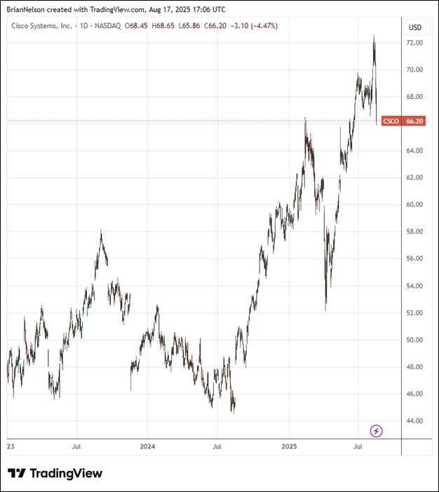For all of fiscal 2026, Cisco is targeting revenue in the range of $59-$60 billion, and non-GAAP earnings per share of $4.00-$4.06, in-line with consensus. Cisco ended the quarter with $16.1 billion of cash and investments on its books and $28.1 billion in short- and long-term debt. We continue to like Cisco and the momentum behind its AI Infrastructure orders. The company remains a holding in the newsletter portfolios. Shares yield 2.5% at the time of this writing.