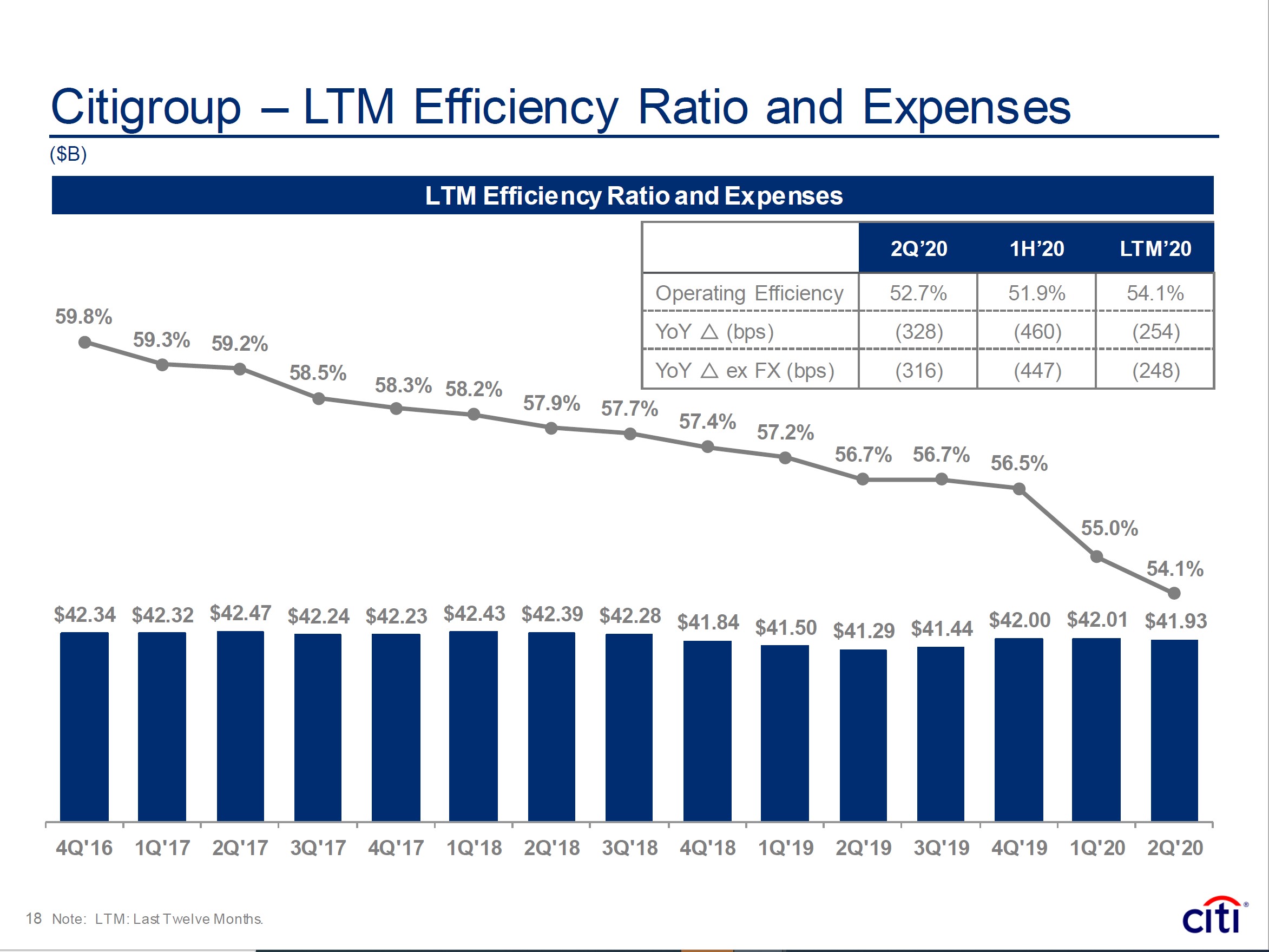 Image Shown: Citigroup has been improving its efficiency ratio steadily over the past 4 years. Image Source: Citigroup 2Q2020 Earnings Presentation
