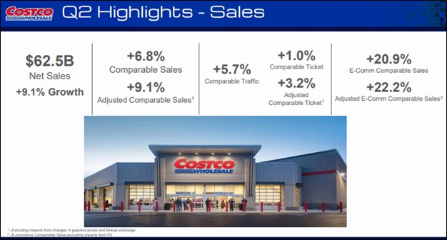 On March 6, Costco (COST) reported mixed second quarter fiscal 2025 results with revenue exceeding the consensus forecast but GAAP earnings per share missing the mark. Net sales in the quarter advanced 9.1%, while total company comparable sales growth came in at 6.8%. E-commerce revenue increased 20.9% (22.2% adjusted) in the 12 weeks ended February 16, 2025. Backing out changes in gasoline prices and foreign exchange, total company comparable store sales increased 9.1% (versus 6.8% consensus). Net income for the quarter came in at $1.788 billion, or $4.02 per share, compared to $1.743 billion, or $3.92 per diluted share in last year’s quarter.