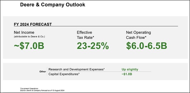 Deere & Company (DE) reported better than expected fiscal third quarter results on August 15 with revenue and GAAP earnings per share coming ahead of the consensus forecasts. Worldwide net sales and revenues fell 17% on a year-over-year basis, accelerating from the 11% fall through the first nine months of the year, but this was better than feared. Net income of $6.29 per share in the quarter fell from $10.20 per share in the quarter ended July 30, 2023. Net income dropped 42% on a year-over-year basis.