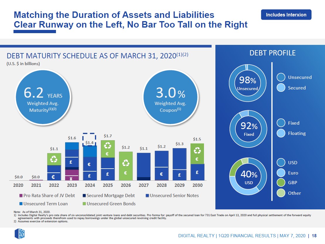 Image Shown: Shares of Digital Realty Trust Inc, a holding in both our Dividend Growth Newsletter and High Yield Dividend Newsletter portfolios, have outperformed the S&P 500 (SPY) by a wide margin over the past year and that’s before taking dividend considerations into account. By Callum Turcan On May 7, the data center real estate investment trust (‘REIT’) Digital Realty Trust Inc (DLR) reported first-quarter 2020 earnings. Though the firm’s near-term guidance disappointed investors, management communicated that the medium- and long-term trajectory of Digital Realty’s financial and operational performance remained strong. Furthermore, its liquidity position and its dividend coverage continued to be rock-solid, particularly after factoring in the data center REIT’s ongoing access to equity markets and lack of near-term debt maturities. Data centers are generally considered “essential” activities around the world given we live in the digital age and these assets have continued to operate during the pandemic. Shares of DLR yield ~3.4% on a forward-looking basis as of this writing. Outlook and Dividend Payout Strength Digital Realty expects to generate $5.90-$6.10 per share in core funds from operations (‘core FFO’) in 2020, and after taking foreign currency translation adjustments into account, that goes up to $5.95-$6.25 per share on a constant-currency basis. In 2019, Digital Realty generated $6.65 per share in core FFO, meaning that its financial performance is coming under fire from a few factors including 1) elevated lease expiration activity that saw Digital Realty’s cash rental rates shift lower last year (with that effect carried on into 2020), 2) the expiration of “vintage” lease agreements, and 3) pressures from the ongoing coronavirus (‘COVID-19’) pandemic. Management expects that the new rental rates on lease renewals this year will be down by low single-digits on a cash basis (and flat on a GAAP basis) as many of these are renewals covering vintage lease agreements that were signed at arguably premium rates several years ago. Stay-at-home orders have negatively impacted construction activity (Digital Realty’s construction activities have also been negatively impacted to varying degrees) which could lead to supply constraints. Going forward, management also mentioned (during the firm’s latest quarterly conference call) that “(it) expect(s) to see continued gradual improvement on cash re-leasing spreads into 2020 and beyond” as Digital Realty cycles through its vintage lease renewals--and the uplift from rising data center demand and constraints on supply growth due to barriers to entry (eventually) kick in. While many market participants were expecting that rising data center demand would result in a more favorable outlook for Digital Realty (particularly as it concerns the near-term trajectory of cash rental rates), management noted that “(it has) yet to see broad-based rental rate growth across most markets” other than in “a few select supplies constrained regions and metro areas,” which indicates that the pandemic must be making rent increases a trickier task than expected (and that’s coming on top of the headwinds created by vintage leases expiring). All things considered, demand for data centers remains very strong, and that supports Digital Realty’s expected cash flow generation this year (even if those cash flows are now expected to come in slightly below previous consensus expectations). As many households are forced indoors due to stay-at-home orders and the “cocooning” of households (as the world waits for a COVID-19 vaccine to get discovered and mass produced), Digital Realty’s asset base remains an integral part of the global economy as we get deeper into the digital era. Things are not looking dire at Digital Realty, far from it, as the REIT continues to possess solid dividend coverage and a nice liquidity position (which we’ll cover in the next section in this article). On a core FFO payout basis, at the midpoint of Digital Realty’s 2020 guidance, its payout ratio is expected to be ~75% this year (derived from Digital Realty’s annualized dividend payout of $4.48 per share divided by expected core FFO of $6.00 in 2020). Digital Realty’s adjusted (to take into account its access to equity markets) Dividend Cushion ratio of 2.9 provides for solid support during these harrowing times. Please note that as a capital-market dependent entity, Digital Realty needs to retain access at all times to debt and equity markets to raise funds (ideally at attractive rates) to have the cash on hand to meet its growth ambitions and dividend obligations (that appears to be the case, which we’ll cover later on in this article). Digital Realty generated negative free cash flows during the first quarter of 2020, and historically, the data center REIT has not generated meaningful positive free cash flows as the firm is investing heavily in growing its asset base. While same-store cash net operating income (‘NOI’) is expected to shift lower by 2.5%-3.5% this year, Digital Realty’s payout coverage remains rock-solid. As the global economy eventually emerges from the pandemic-induced lockdown and related economic recession, Digital Realty should be on much stronger operational footing as headwinds fade and tailwinds emerge (in part due to expected future supply constraints and in part due to Digital Realty growing its presence in key metropolitan hubs where supply constraints already exist). Recent and Expected Financing Maneuvers In January 2020, Digital Realty issued "€1.7 billion of Euro-denominated notes with a weighted-average maturity of approximately seven years and a weighted-average coupon of approximately 1.0%” with a large portion of those proceeds used to retire “€1.2 billion of Interxion's outstanding senior notes” which was taken on after Digital Realty acquired Interxion in March 2020. Interxion