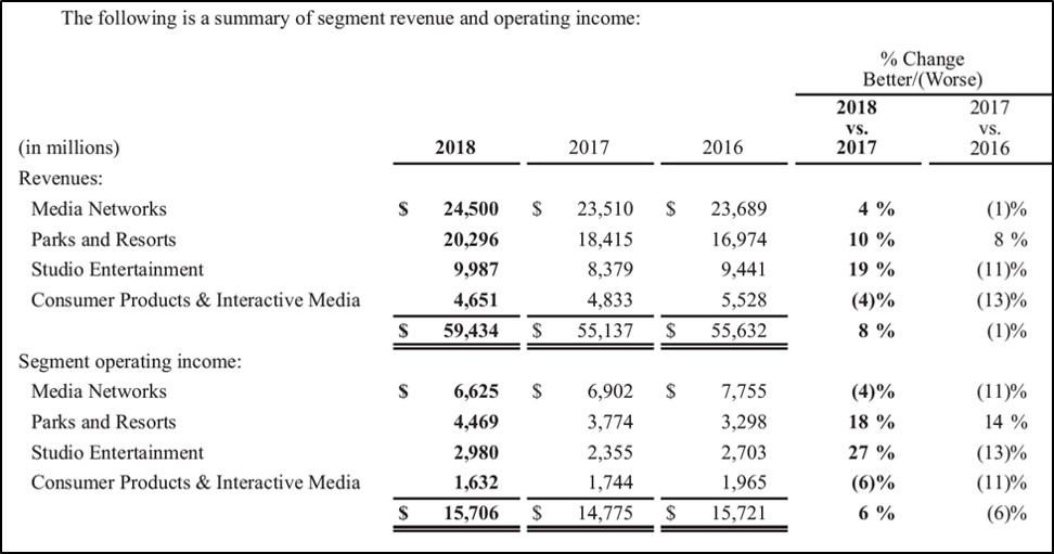 Image Shown: Disney generated over a quarter of its fiscal 2018 segment operating income from its ‘Parks and Resorts’ operations. Image Source: Disney – Fiscal 2018 Annual Report