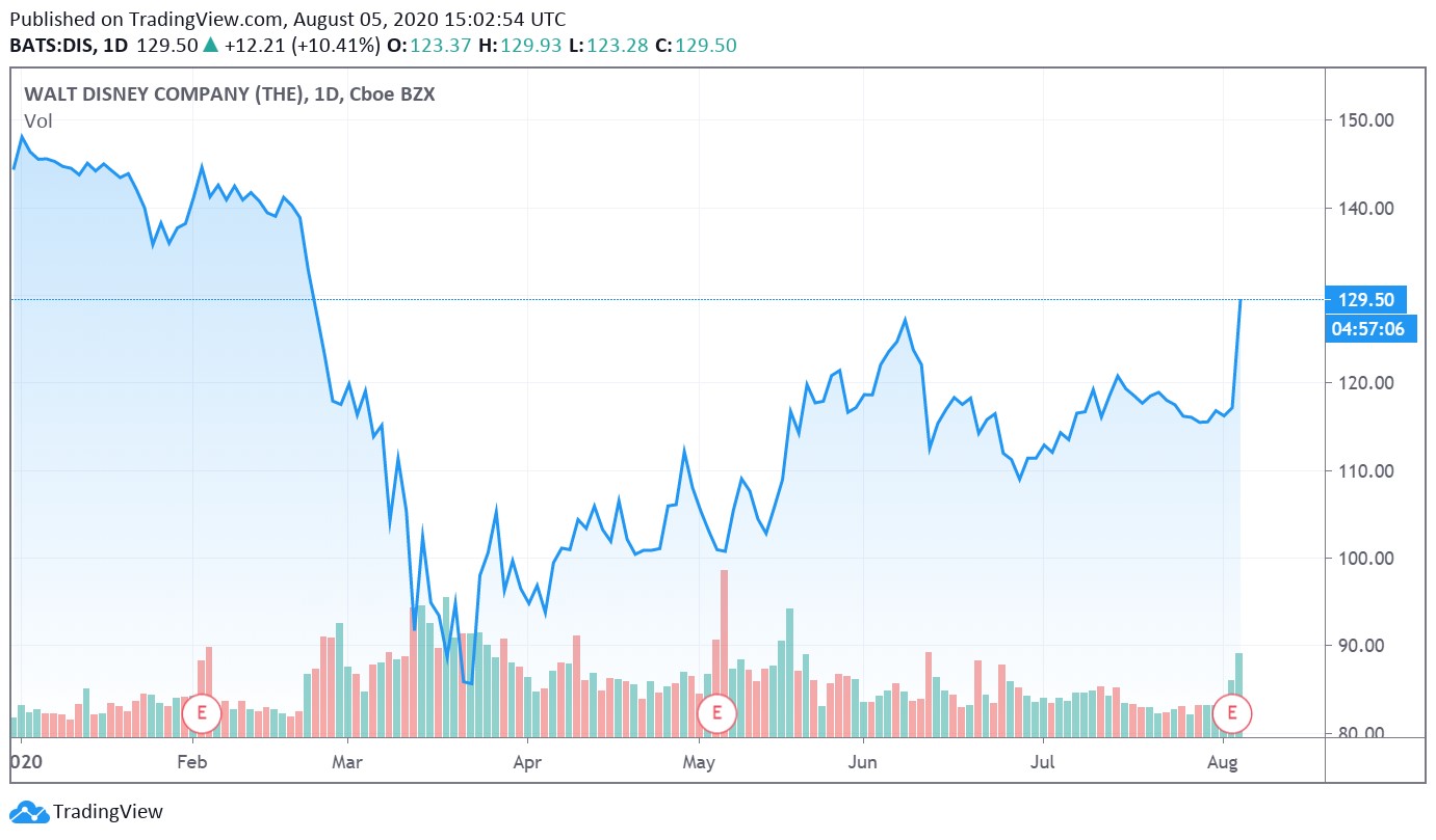 Image Shown: The Walt Disney Company recently reported earnings which highlighted the ongoing success of its video streaming strategy. Shares of DIS surged upwards on August 5, 2020.