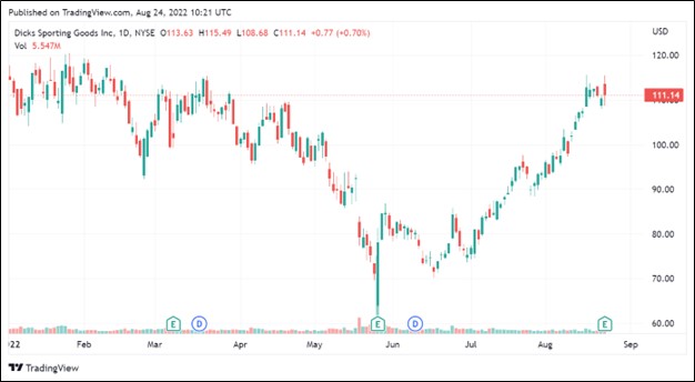 Image Shown: Shares of Dick’s Sporting Goods Inc have been on a nice upward climb of late. The sporting goods retailer raised its full-year guidance for fiscal 2022 during its fiscal second quarter earnings report.