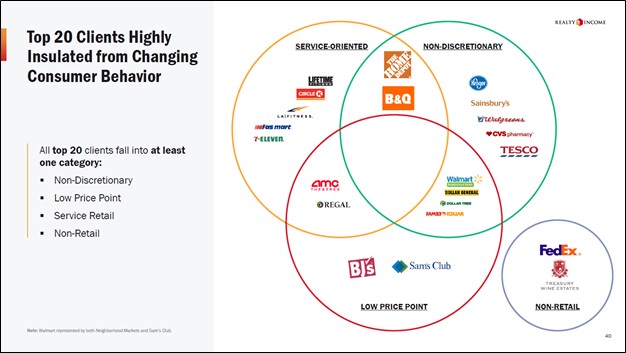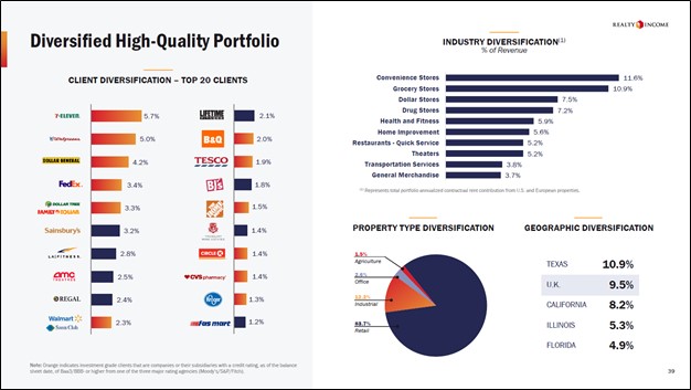 Image Shown: An overview of dividend growth idea Realty Income Corporation’s tenant base, though this appears to be before taking into account its recent merger with VEREIT and spinoff of its corporate office properties portfolio. Image Source: Realty Income Corporation – November 2021 IR Presentation