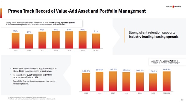 Image Shown: Over the past several years and during the first nine months of 2021, Realty Income has done a solid job on the re-leasing and rental rate increasing front. Image Source: Realty Income – November 2021 IR Presentation