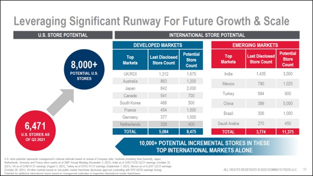Image Shown: Domino’s sees room for ample unit store count growth. Image Source: Domino’s – 2022 ICR Conference Presentation