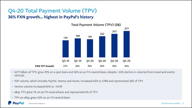 PayPal has been a huge beneficiary of the proliferation of e-commerce and the rising number of digitally-enabled financial transactions. Its peer-to-peer money transfer app Venmo continued to post stellar performance as the app’s TPV was up 60% year-over-year in the final quarter of 2020 according to management commentary during PayPal’s latest earnings call (emphasis added):