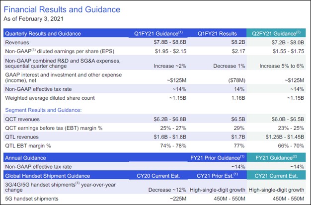 Image Shown: An overview of Qualcomm’s near-term outlook and recent historical performance. Image Source: Qualcomm – First Quarter of Fiscal 2021 Financial Results and Guidance IR Presentation
