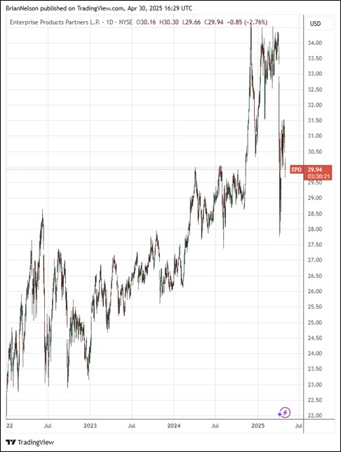 In the first quarter of 2025, Enterprise Products Partners repurchased $60 million of its common units, with the partnership having utilized about 60% of its authorized $2 billion buyback program. Adjusted cash flow from operations was $2.1 billion for both the first quarter of 2025 and 2024. Total capital expenditures were $1.1 billion in the first quarter of 2025, consisting of $960 million in growth capital and $102 million in sustaining capital expenditures. Total debt outstanding was $31.9 billion, and Enterprise had total liquidity of $3.6 billion. We continue to like Enterprise’s DCF coverage of the distribution, and the company remains an idea in the High Yield Dividend Newsletter portfolio.