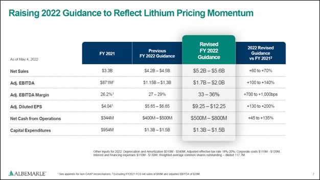 Image Shown: Albemarle raised its guidance for 2022 during its first quarter earnings report due primarily to continued outperformance at its Lithium segment. We caution that Albemarle expects to generate sizable negative free cash flows this year due to its elevated capital expenditure expectations as it brings new lithium operations online. Image Source: Albemarle – First Quarter of 2022 IR Earnings Presentation