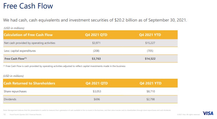 Visa ended its fiscal 2021 with ~$16.5 billion in cash and cash equivalents, another ~$0.9 billion in restricted cash, and ~$3.7 billion in investment securities against long-term debt of ~$20 billion and current maturities of debt of ~$1 billion. Though Visa does have a modest net debt position, we continue to like its tremendous free cash flow generation and asset-light business model. For example, during fiscal 2021, capital spending dropped to $705 million from $736 million, while operating cash flow surged to $15.2 billion from $10.4 billion a year-ago.