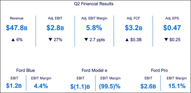 Looking to all of 2024, Ford maintained its guidance range for adjusted EBIT between $10-$12 billion. It raised its adjusted free cash flow guidance $1 billion to the range of $7.5-$8.5 billion. Traditional free cash flow for the first six months of 2024 totaled $2.7 billion, which was in excess of the company’s cash dividends paid of $1.9 billion over the same time. Ford ended the June quarter with $100.3 billion in long-term debt, including Ford Credit, and $40.2 billion in cash and marketable securities.