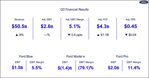 On October 23, Ford (F) reported better than expected third quarter results. In the quarter, revenue hit a record $50.5 billion (up 9% year-over-year), net income was $2.4 billion (up from $0.9 billion in the year-ago period), while adjusted EBIT came in at $2.6 billion (flat compared to last year’s quarter), inclusive of $0.7 billion of adverse net tariff-related impacts. Operating cash flow was $7.4 billion (up from $5.5 billion last year), with adjusted free cash flow coming in at $4.3 billion, up from $3.2 billion in last year’s quarter. Adjusted diluted earnings per share was $0.45, down from $0.49 in the same period a year ago, but $0.09 better than expectations.