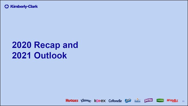 Kimberly Clark spent ~$1.2 billion in cash acquiring Softex Indonesia (about 80% of this company’s revenues came from diapers) through a deal that was completed in October 2020. The firm forecasts its adjusted operating profit (a non-GAAP measure) will grow by up to 2% year-over-year in 2021 as the favorable impact from its expected net sales growth and ongoing restructuring program will be largely offset by rising input prices and distribution expenses. Kimberly Clark’s adjusted EPS (another non-GAAP figure) is expected to reach $7.75-$8.00 in 2021, up from $7.74 in 2020.