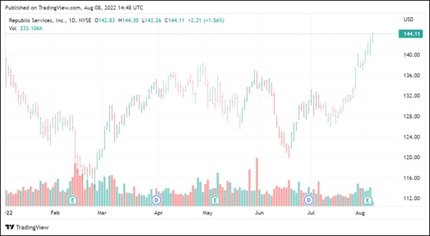 Image Shown: Shares of newsletter portfolio idea Republic Services Inc have put up strong performance so far year-to-date in the face of volatile capital markets.