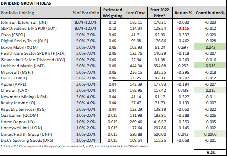You all know that the SPDR Portfolio S&P 500 High Dividend ETF (SPYD) is down ~14.3% so far this year, that bonds (AGG) are off ~17.4% so far this year, that SPDR S&P 500 Trust ETF (SPY) is down ~23.5% so far this year, the Vanguard Real Estate ETF (VNQ) is down ~32.6%, the iShares Mortgage Real Estate Capped ETF (REM) is down ~40.0% –and here we are with the simulated Dividend Growth Newsletter portfolio down just ~8.4% on a price-only basis, excluding dividends!