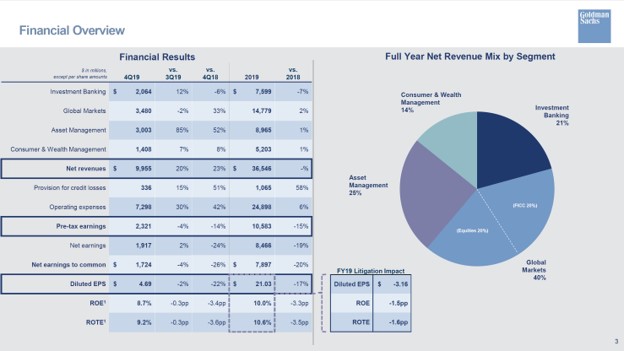For the year, Goldman’s revenues were flat and diluted earnings per share were down 17%. The 1MDB litigation-impact hit annual EPS by $3.16 and return on tangible equity by 1.6 percentage points, resulting in a 10.6% ROTE for 2019. Simply put, we are not impressed by this figure. Goldman claims number-one position in many investment banking and trading categories, but it clearly struggles to convert that into returns on capital above the cost of capital, which is pretty damning 11 years into a bull market cycle.