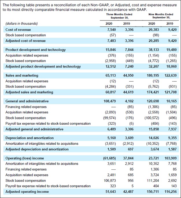 GoodRx reported that its GAAP revenues were up 44% year-over-year during the first three quarters of 2020 (revenue increased 38% in the third quarter), largely due to impressive growth at its prescription-related businesses. While its other offerings grew meaningful, those businesses represented only a small portion of GoodRx’s company-wide revenues. Its GAAP operating income fell during this period due to a sharp increase in its operating expenses, though we still stress that this was largely a product of IPO-related expenses. On a normalized basis, GoodRx generates meaningful positive operating income and its non-GAAP adjusted operating income continued to grow during the first nine months of 2020 on a year-over-year basis, as one can see in the upcoming graphic down below.