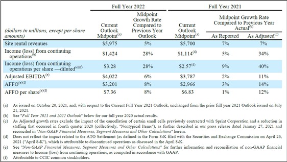 Based on the expected growth in cash flows for full-year 2022 and consistent with our investment-grade credit profile, we expect to fund our discretionary Capex with free cash flow and incremental debt capacity without the need for new equity for the [fourth] consecutive year. In addition, we believe our business and balance sheet are well positioned to support consistent AFFO growth through various economic cycles, including during periods of higher inflation and interest rates.” — Daniel Schlanger, EVP and CFO of Crown Castle