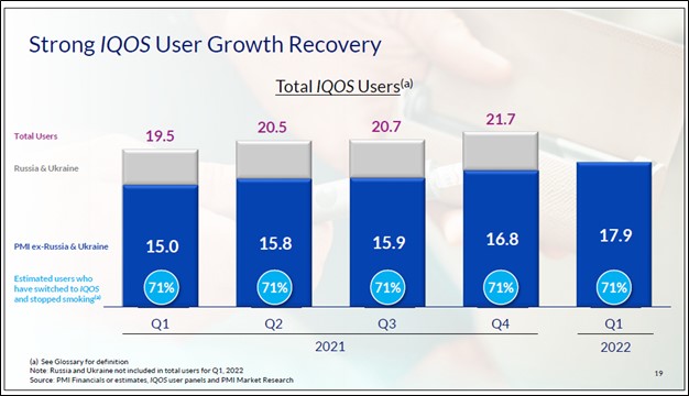 Image Shown: Philip Morris’ IQOS user base, excluding the Russian and Ukraine markets, is growing robustly. Image Source: Philip Morris – First Quarter of 2022 IR Earnings Presentation