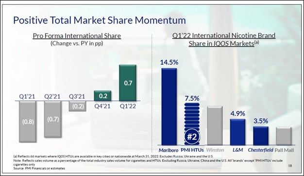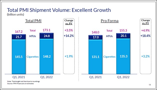 Image Shown: Philip Morris is steadily growing its HTU shipment volumes and sales of its traditional cigarette brands are holding up well. Image Source: Philip Morris – First Quarter of 2022 IR Earnings Presentation