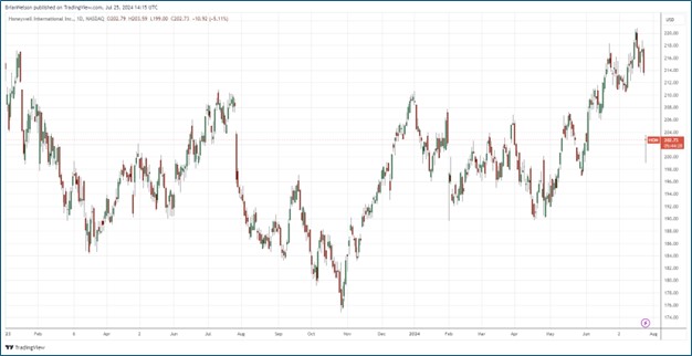 On July 25, Honeywell (HON) reported better than expected second quarter results with revenue and non-GAAP earnings per share coming in higher than the consensus forecast. Reported sales advanced 5% thanks to organic revenue growth of 4%, hitting the high end of its previous guidance. Adjusted earnings per share of $2.49 was above the high end of its previous guidance. Thanks to strength in its ‘Building Automation’ and ‘Energy and Sustainability Solutions’ divisions, orders were up 4%.