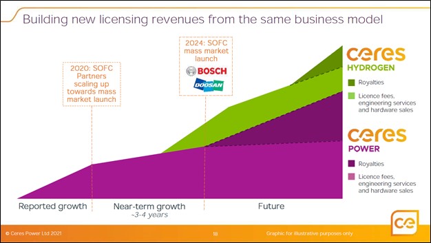 Image Shown: As products built using Ceres Power’s fuel cell technology are rolled out over the coming years, the firm aims to build up a sizable licensing and royalty business that should enable Ceres Power to become a financially sustainable entity. Image Source: Ceres Power – First Half of 2021 Interim Report IR Presentation