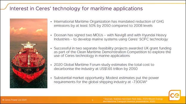 Image Shown: Decarbonizing the marine industry represents a massive market opportunity for Ceres Power. Image Source: Ceres Power – First Half of 2021 Interim Report IR Presentation