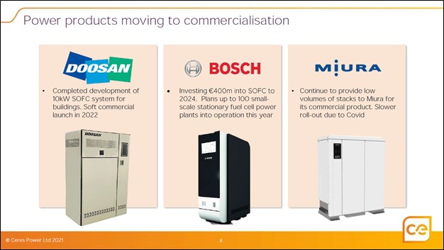 “And then, to the right of that, you see Miura in Japan. Miura is our first partner to launch commercial products, and we’re continuing to provide low volume for stacks to Miura to support its commercialization. Some of that commercialization has been somewhat slower with COVID because they address the commercial market at convenience stores, office blocks, et cetera. But we’re very pleased with the relationship with Miura and the technology progress that we’ve made to date there.” — CEO of Ceres Power