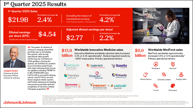 Johnson & Johnson (JNJ) recently reported first quarter results that showed revenue and non-GAAP earnings per share exceeding the consensus forecast. First quarter reported sales growth was 2.4%, with operational growth of 4.2% and adjusted operational growth of 3.3%. First quarter earnings per share increased to $4.54, while adjusted earnings per share advanced 2.2%, to $2.77. Management had the following to say about the results: