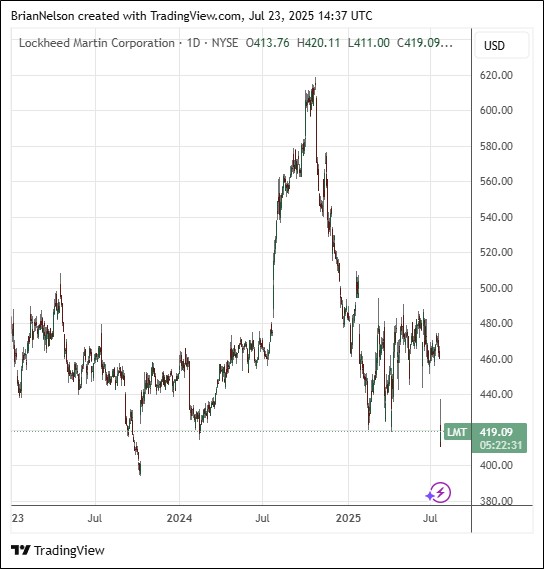 Lockheed Martin (LMT) recently reported disappointing second quarter results that showed a miss on the top line versus consensus and pre-tax losses on programs of $1.6 billion and other charges of $169 million, combining to impact earnings per share by $5.83. Second quarter sales came in at $18.2 billion, up from $18.1 billion in the second quarter of 2024. Net earnings of $1.46 per share compared to $6.85 per share in last year’s quarter. Cash from operations was $201 million compared to $1.9 billion in last year’s quarter, while free cash flow dipped into negative territory, compared to $1.5 billion in the second quarter of 2024.
