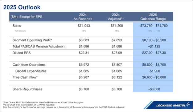 Lockheed paid $3.1 billion in cash dividends in 2024, while it spent $3.7 billion in share buybacks during the year. Looking to 2025, Lockheed Martin expects revenue in the range of $73.75-$74.75 billion, in line with the consensus forecast of $74.1 billion, business segment operating profit of $8.1-$8.2 billion, while diluted earnings per share is targeted in the range of $27-$27.30, below the consensus forecast of $27.94. Cash flow from operations is expected in the range of $8.5-$8.7 billion in 2025, while free cash flow is expected in the range of $6.6-$6.8 billion, after roughly $1.9 billion in capital spending. Shares yield 2.9% at the time of this writing.