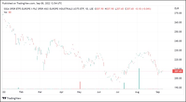 Image Shown: The SSGA ETFS Europe II PLC SPDR MSCI Europe Industrials UCITS ETF, listed in the UK, tracks large and mid-sized European industrial firms. Shares of the ETF have fallen sharply year-to-date as recessionary fears across Europe have grown substantially in the wake of the Russian invasion of Ukraine in February 2022 and the related European energy crisis.