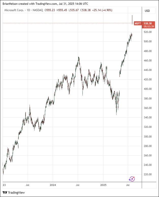 On July 30, Microsoft (MSFT) reported awesome fiscal fourth quarter results with both revenue and GAAP earnings per share exceeding the consensus forecast. Revenue of $76.4 billion increased 18% (up 17% in constant currency), better than consensus of $73.8 billion, while operating income increased 23% (up 22% in constant currency). Net income increased 24% (up 22% in constant currency), while diluted earnings per share was $3.65, up 24% and 22% in constant currency, and better than consensus of $3.38 per share.