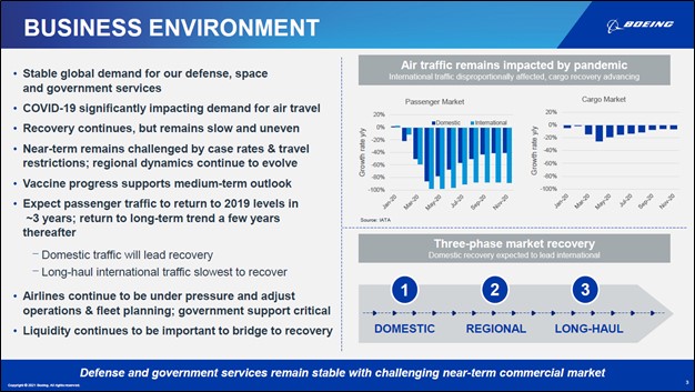 Image Shown: Though the past year has been brutal for the commercial airliner and aerospace industries and it will continue to be rough sledding in the near term, Boeing is optimistic that within a few years passenger traffic will return to pre-pandemic levels and resume its growth trajectory thereafter. Image Source: Boeing Company – Fourth Quarter of 2020 IR Earnings Presentation