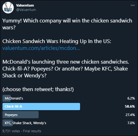 Image Shown: It appears that social media users continue to view Chick-fil-A and Popeyes as the two dominant quick-service restaurants in the “US Chicken Sandwich War” as McDonald’s gets ready to enter the fray.