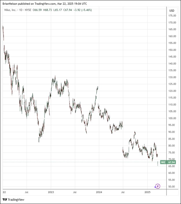 On March 20, Nike (NKE) reported better than expected third quarter fiscal 2025 results, but the firm’s outlook signaled continued difficulties. Third quarter revenues were down 9% on a reported basis and 7% on a currency-neutral basis. Nike Brand revenues fell 9% on a reported basis and 6% on a currency-neutral basis, as the firm faced declines in all geographies. Nike Direct revenues dropped 12% on a reported basis and 10% on a currency-neutral basis. Wholesale revenues fell 7% on a reported basis and 4% on a currency-neutral basis. Revenues for Converse dropped 18% on a reported basis and 16% on a currency-neutral basis.